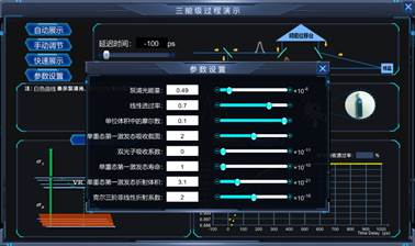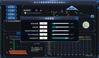操作过程:双击样品的前表面,出现样品的选择界面(下同),选择ZnO样品,该样品为典型的双光子吸收的材料,具有代表性。进入过程显示界面后,可以通过手动调节观察某一个时间延迟时粒子的跃迁状态以及对透射能量的影响。该要求学生改变两个参数两次,并将两次区别写入实验报告中,总结改变参数后对实验结果的影响。